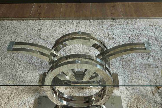 Esta é uma mesa de jantar em nossa baixa série de prata luxuosa. É feita do vidro moderado e da base de aço inoxidável. A base adota o projeto da gaivota, simples e novo. A tabela pode acomodar 8-10 amigos para o jantar ou recolhimentos pequenos da família. A fim reduzir o espaço, o empacotamento é dividido no vidro e a base dois que empacota, esta maneira é mais conveniente para o transporte.
