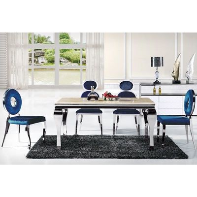 A mesa de jantar é principalmente do projeto simples, apropriado para a compra na casa. O estilo simples é durável, não a cor da flor, mas a prata de aço inoxidável clássica como a cor principal. O tabletop pode escolher usar o mármore ou o painel do MDF. Este estilo foi comprado sempre em grandes quantidades por negociantes principais da mobília.